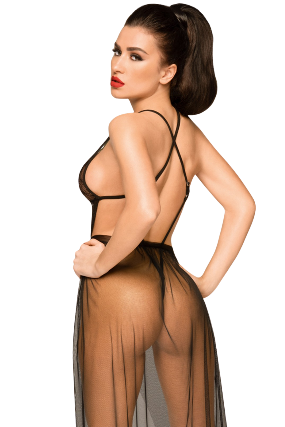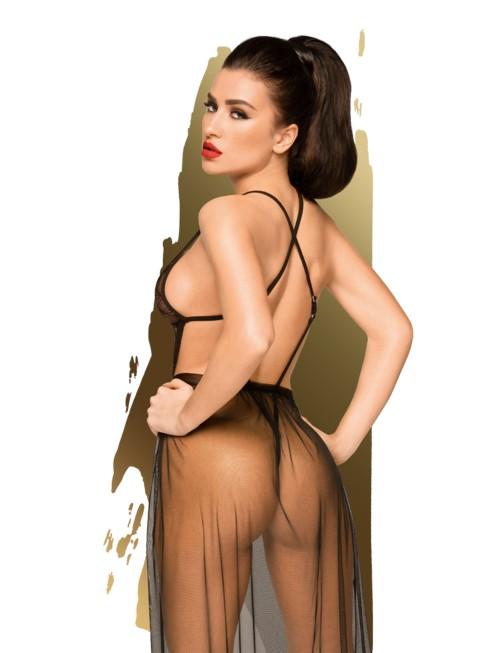Este conjunto está pensado para provocar esa sensación de “esto va a ser una noche inolvidable”. El body de encaje negro abraza el cuerpo con un patrón floral sensual y un escote que realza sin esfuerzo. La espalda se convierte en protagonista gracias a los tirantes cruzados, que dibujan líneas finas y sofisticadas sobre la piel. La magia está en la segunda capa: una falda de voile negro vaporosa y transparente que cae con movimiento y puedes ajustar a tu medida como quieras: más abierta para insinuar, más cerrada para jugar con el misterio. El resultado es un look de lencería “de escena”, con ese punto cinematográfico que convierte el momento en experiencia. Y sí: viene completo. Incluye tanga a juego para que no falte nada.